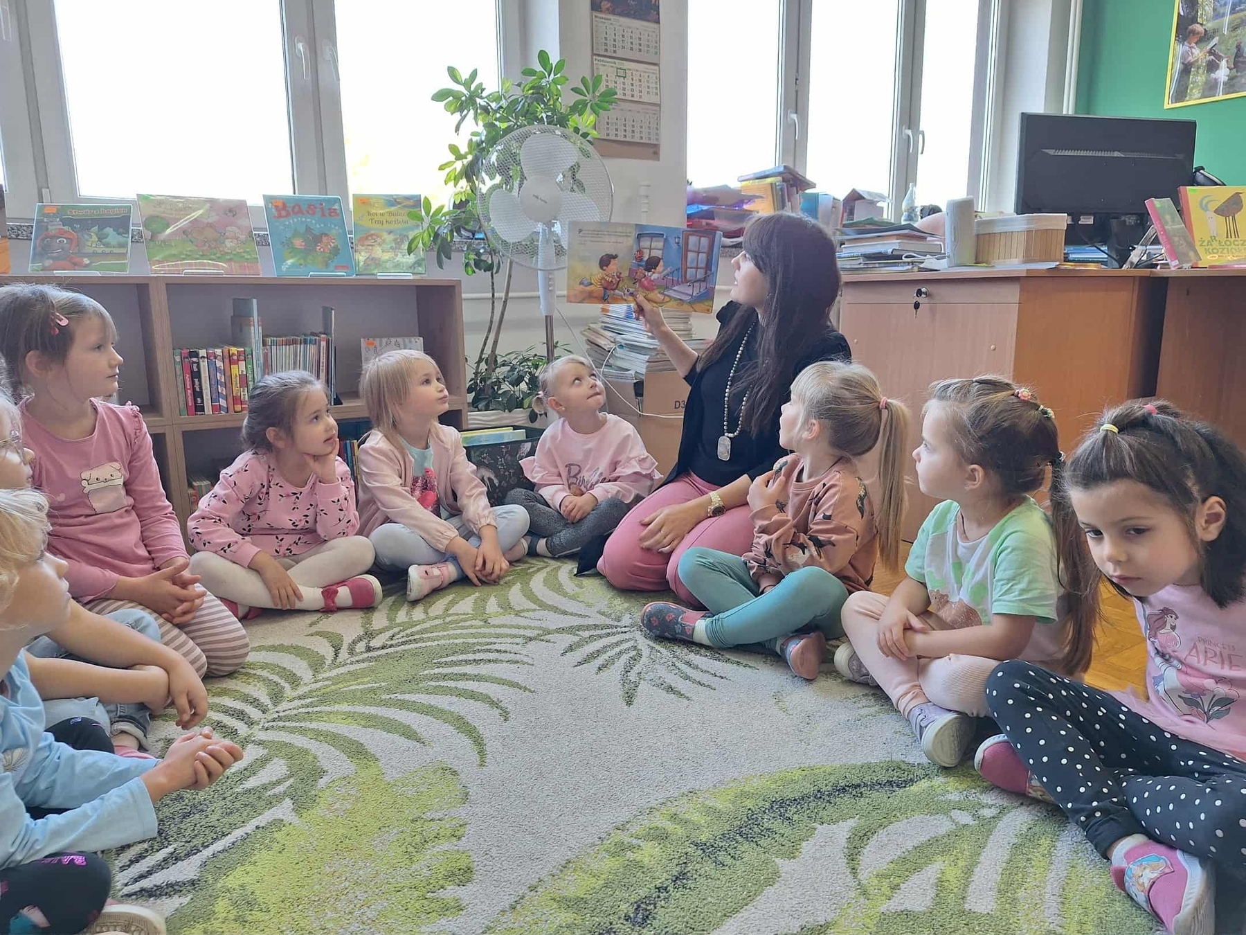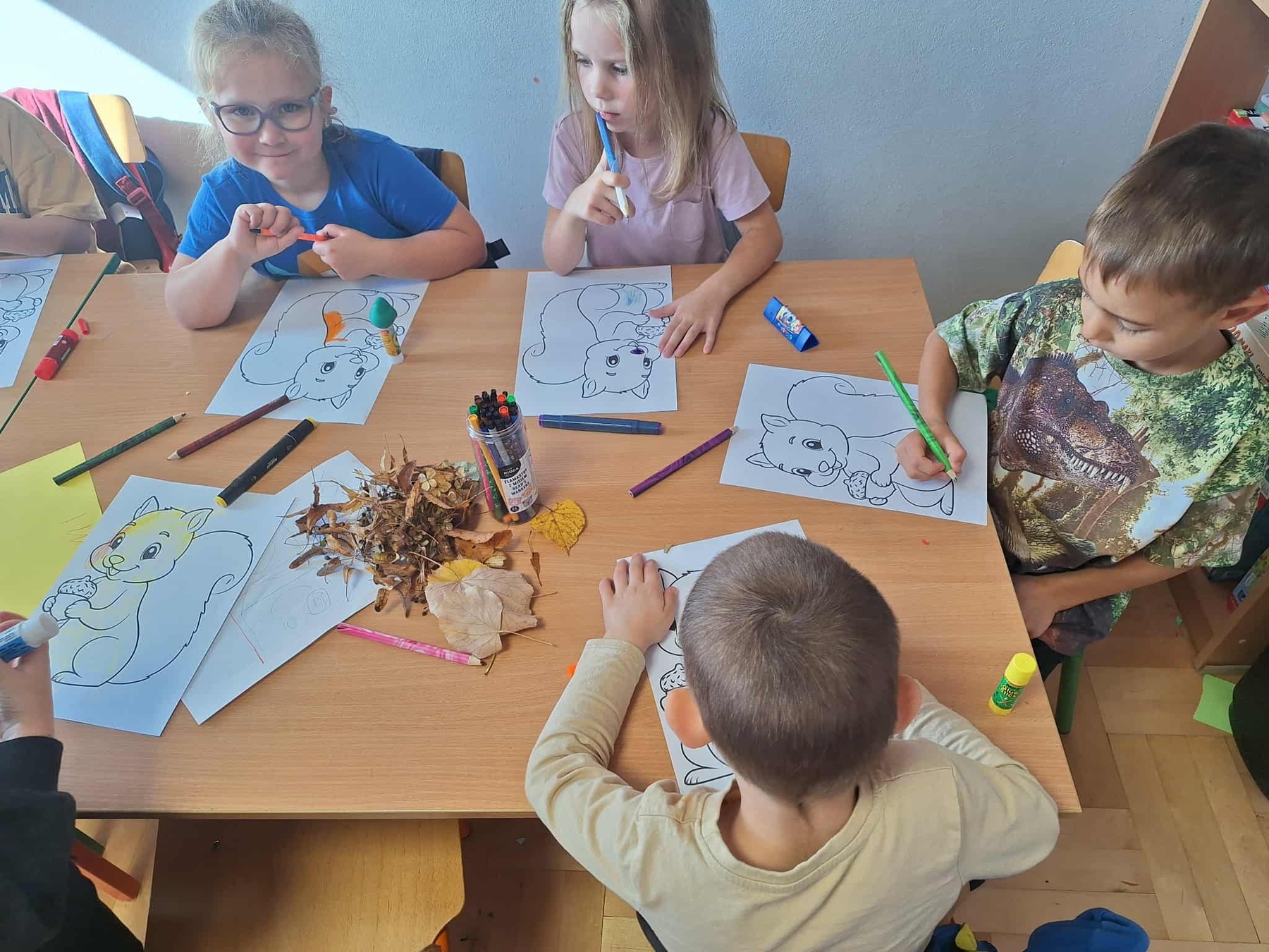 🦊Nasze przedszkolaki – pięcio- i sześciolatki - wzięły udział w czterech spotkaniach z książką. Pierwsze, jak co miesiąc w pierwszy wtorek i środę, odbyły się w salach przedszkolnych, gdzie czytaliśmy opowieść o Wiewiórce Chrupusiu, a następnie stworzyliśmy wiewiórki z liści.